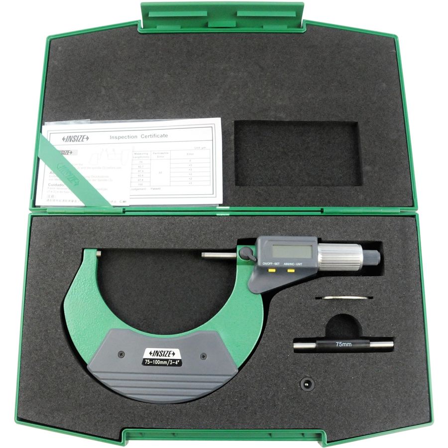 Электронный гладкий микрометр для наружных измерений. Диапазон измерений 75-100 мм. Цена деления 0,001 мм, 0,00005ʺ. Переключение с мм на дюймы, с абсолютных измерений на относительные (ABS/0).
