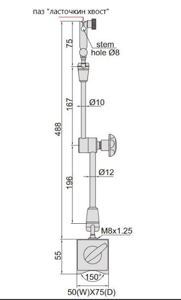 Штатив магнитный для индикаторов (измерительных головок). Усилие отрыва магнита 100 кг.