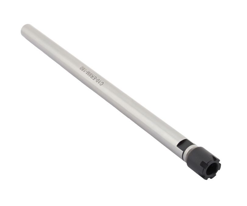 Фрезерный патрон C10-ERM8M-180 (DIN 6535 HA / ISO 3338) используется в условиях большого вылета инструмента или ограниченного доступа к зоне резания. Цилиндрический хвостовик оправки фиксируется в цанговом зажиме большего размера или патроне Weldon (при наличии специальной лыски на хвостовике). Установка режущего инструмента в корпус патрона осуществляется при помощи зажимной цанги ER8 (DIN 6499) и гайки типа M. В зависимости от размера отверстия цанги в патрон устанавливается инструмент с цилиндрическим хвостовиком диаметром от 1 до 5 мм. Длина хвостовика патрона составляет 180 мм.