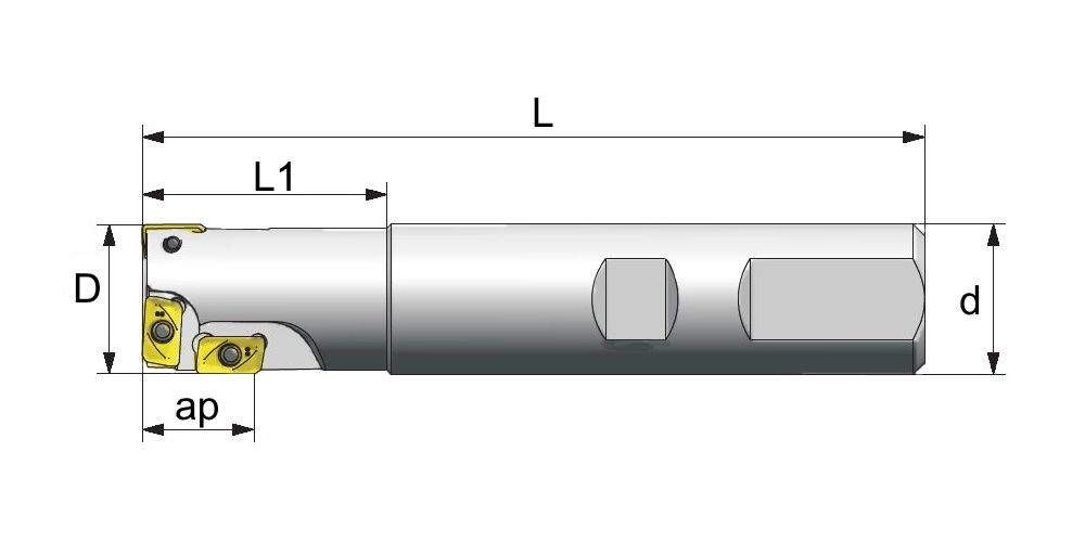 Фреза по металлу со сменными пластинами концевая типа PE03. Угол в плане 90°. Диаметр 40 мм. Хвостовик типа Weldon диаметром 32 мм. Применяемые сменные пластины APMT160408PDER..