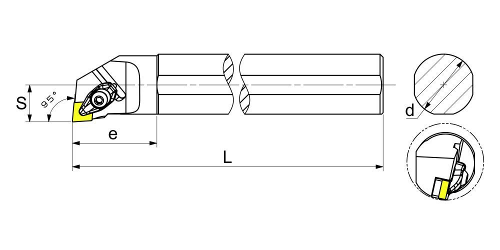 Резец токарный расточной по металлу со сменными пластинами. Для пластин CN..1204. Державка расточная с креплением типа D (двойной прижим кронштейном). С углом в плане 95°. Для контурной обработки.