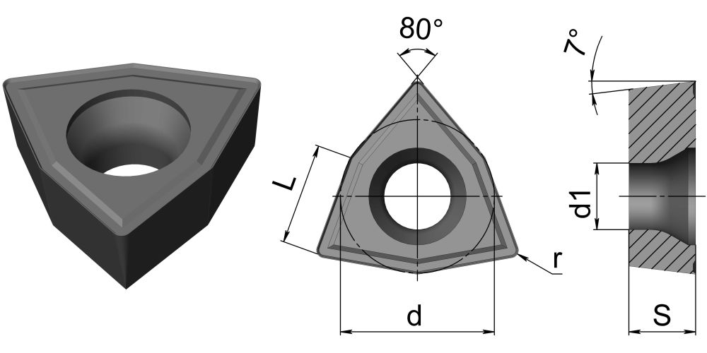 Пластина твердосплавная сменная производства HADSTO. Покрытие: HS5231. Область применения: сверла со сменными пластинами; сталь, нержавеющая сталь, чугун.