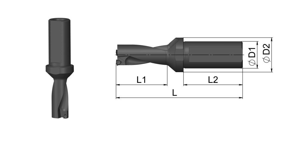 Сверло со сменными пластинами, отношение длины к диаметру D/L=3, типа UD30 с внутренним подводом СОЖ. Рабочий диаметр D=20 мм, диаметр хвостовика Weldon d=25 мм. Максимальная глубина сверления L1=60 мм. Применяемые пластины: SP..060204.